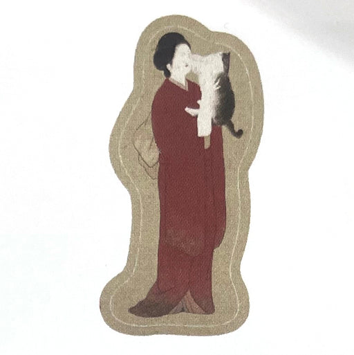 実家の猫と母親がモデルです。母親は猫を溺愛しているのですが、猫はそこまでのようで、母親に抱っこされるといつもこのような形になります。 ※掛け軸のみ、着物の色が異なります(ブルー)