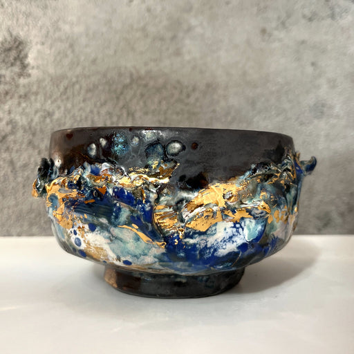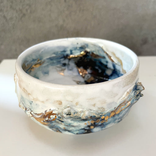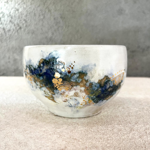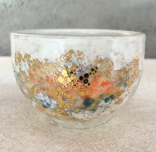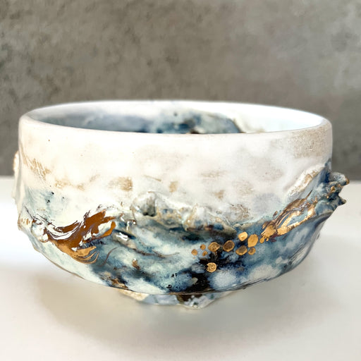 本来は地に根づき、重力に従って咲く花を、あえて器の内と外に配することで、内と外、 上と下、過去と未来、自然と人工といった境界を問いかけています。